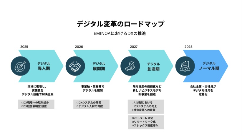 ー 現在 、歯科業界では治療から予防へのシフトが加速しており、患者一人ひとりの口腔内データや生活習慣データの利活用が、歯科医院の競争力を左右する重要な要素となっています。 当社は、従来の製品販売モデルから、AI解析データを基盤とした予防措置モデルへと自らを変革し、他社に対する圧倒的な優位性を築きます。 そして、患者様に本当にお役に立つ情報と歯科医院サポートを通じて飛躍的な健康促進を目指します。